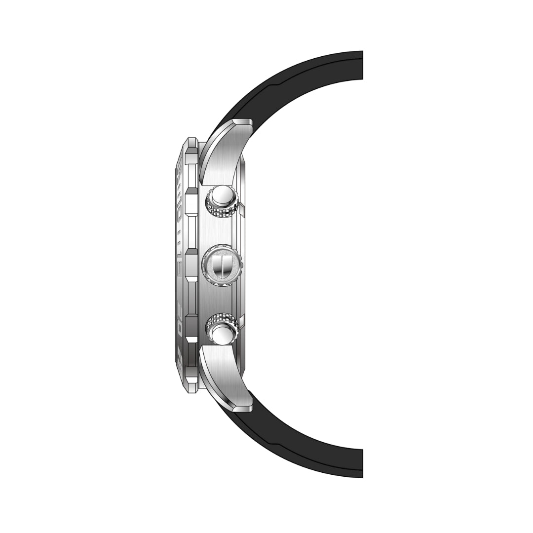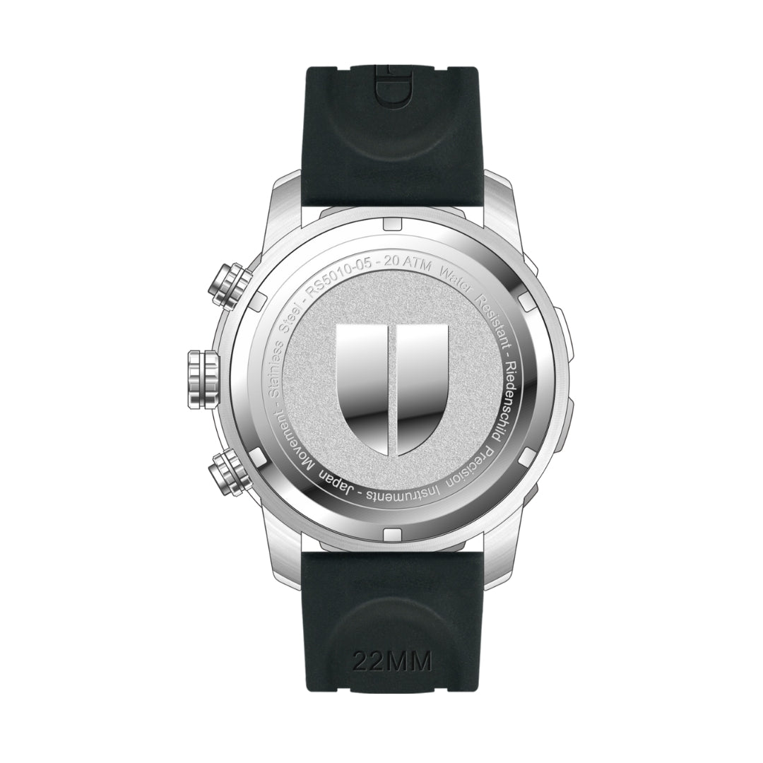 This Riedenschild Navy SEAL sport chronograph combines precision and robustness for water activities. It features a reliable Time Module movement, a stopwatch function, and a date window at 4 o'clock. Its blue dial with white hands and indexes enhances readability under any conditions. The stainless steel case, with a brushed and polished finish, offers superior durability. The rotating bezel and 20 ATM water resistance make it an ideal companion for diving. The black silicone strap provides comfort during extended wear, while the hardened mineral crystal protects against bumps and scratches.